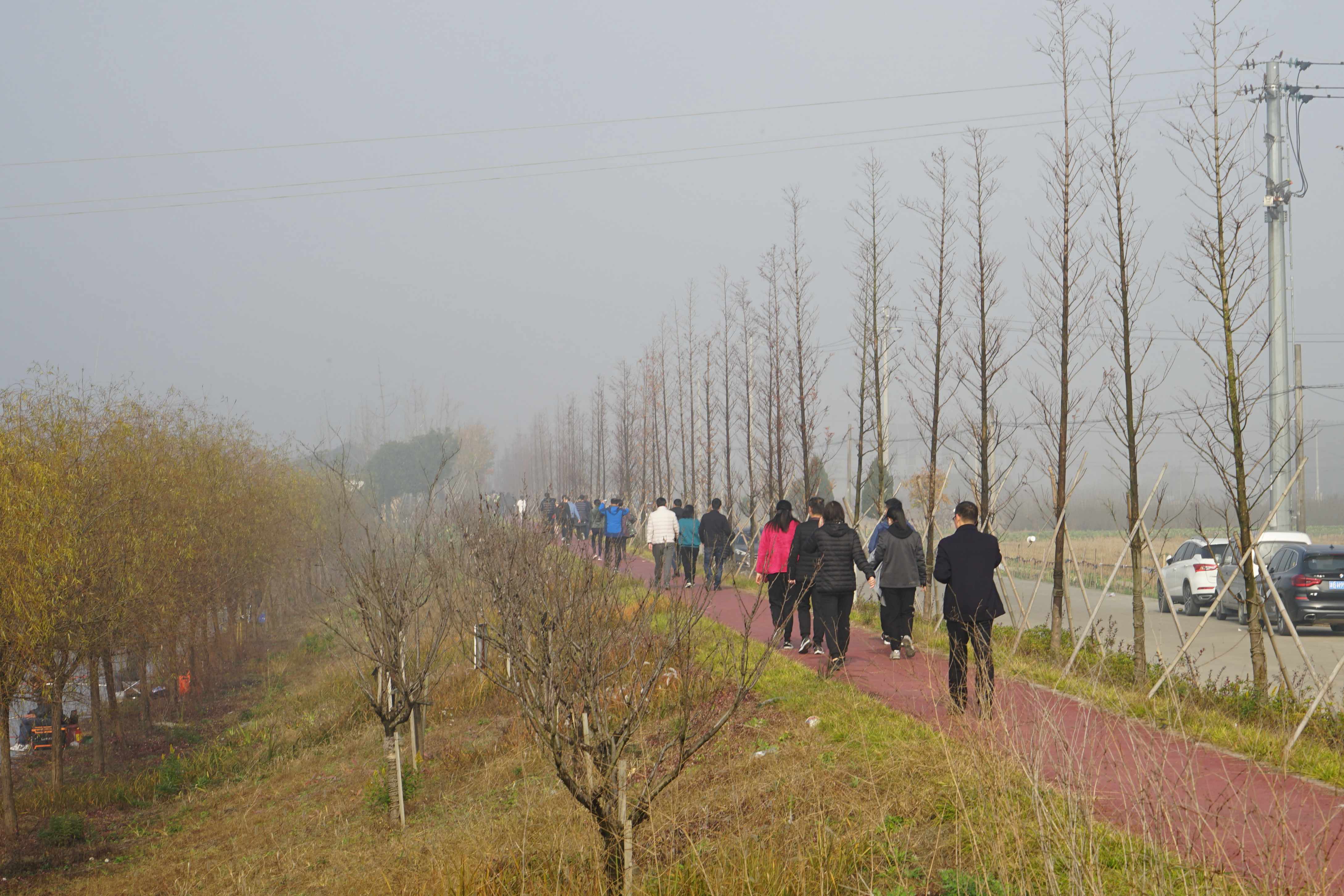 清早的上虞區濕地公園被大霧籠罩,絲絲涼意并沒有影響大家的熱情。8點45分,徒步隊伍集結完畢,活動正式開始。本次徒步賽道以濕地公園為起(訖)點,沿河邊步道抵達四明湖水庫并折返,全程約5.8公里,共設4個補給站。一路上大家你追我趕,興致高昂,使盡渾身解數奮力爭先,隨著陽光漸漸明朗,霧氣也逐漸消退,大家說說笑笑,隨手拍下沿途風景,很好地展現了活動宗旨。